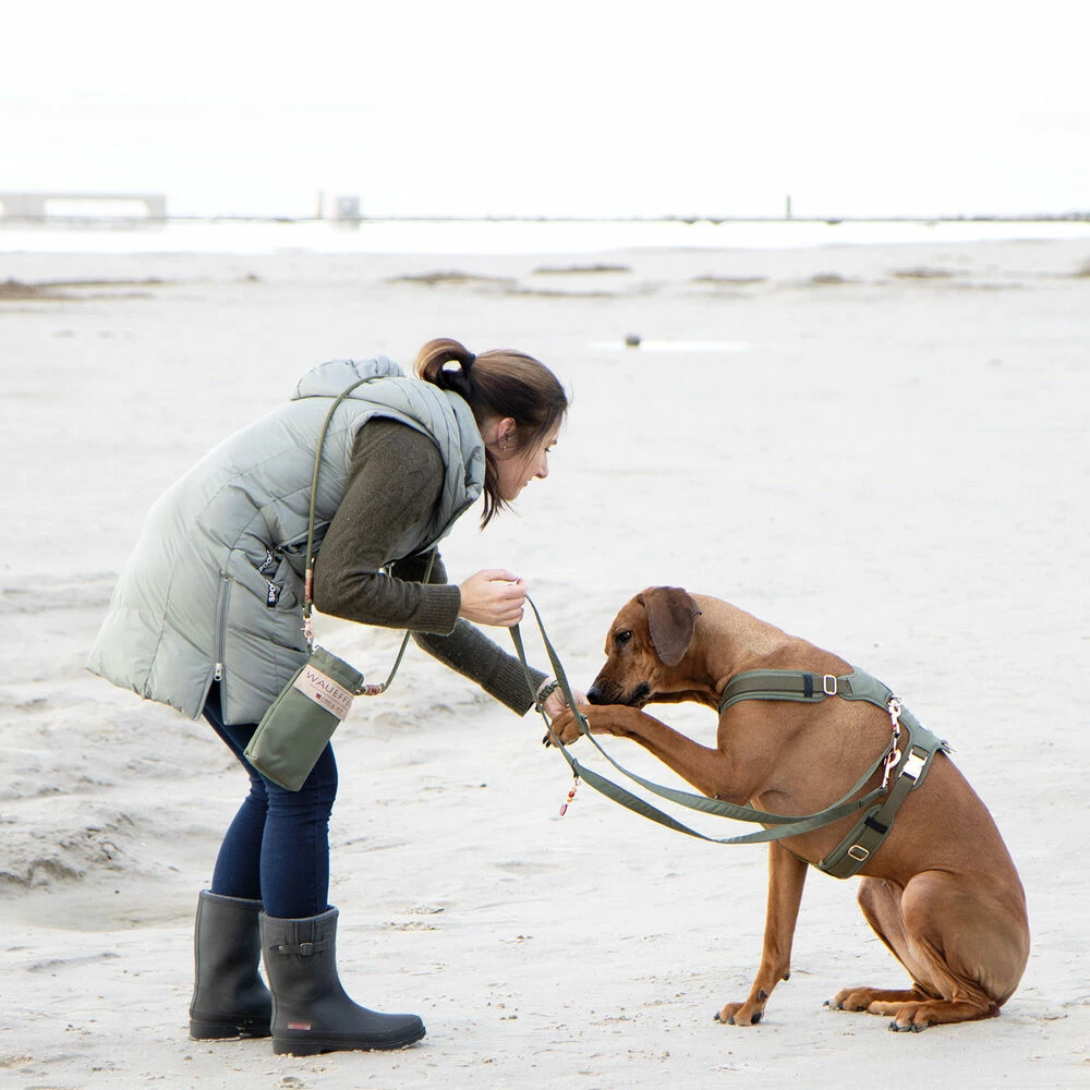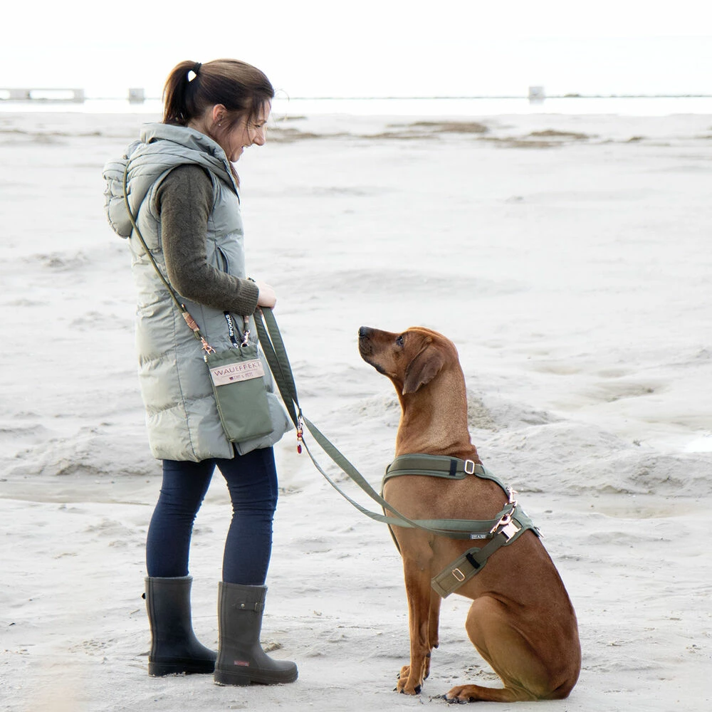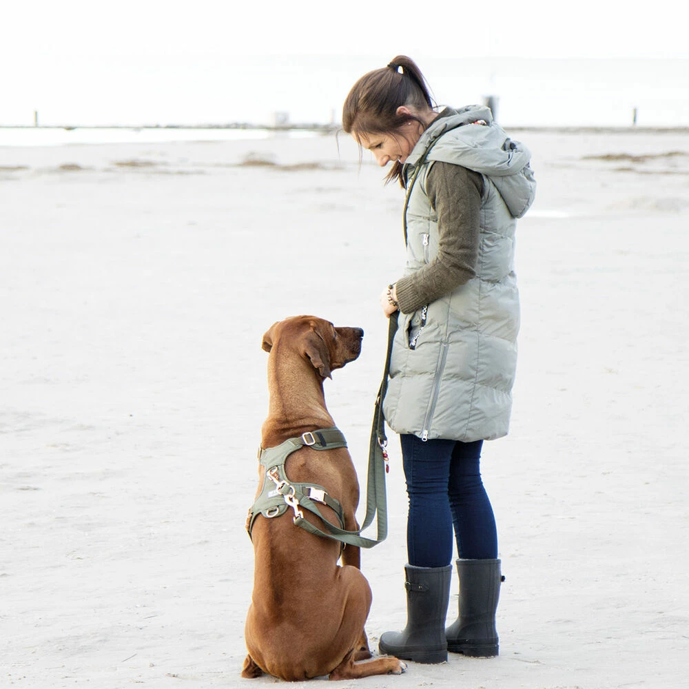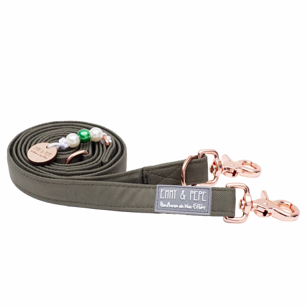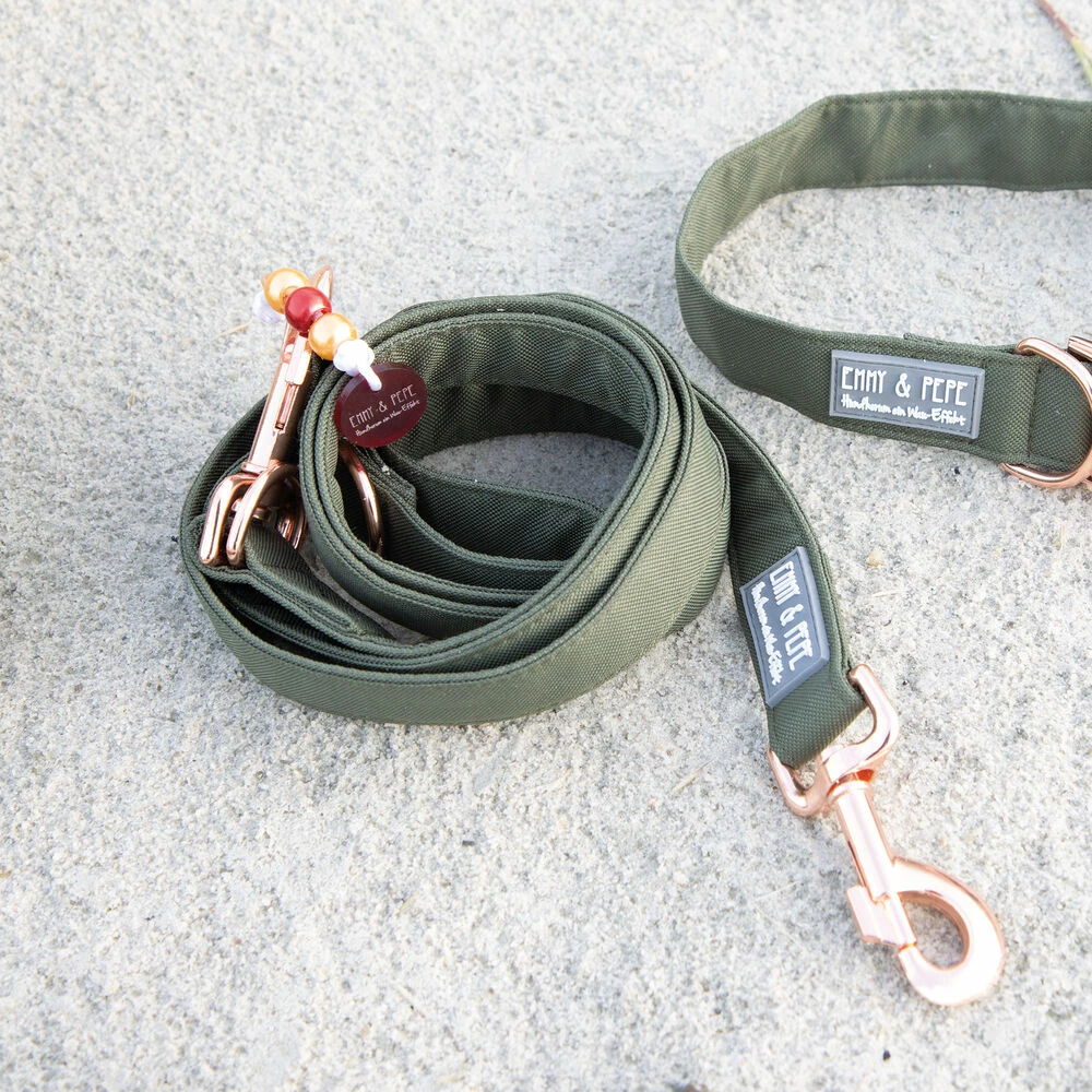 Die Kombination aus roséfarbenen Metallelementen und olivfarbenem Stoff verleiht dieser Leine einen stilvollen Look, den Ihr Hund sicherlich lieben wird. Gönnen Sie Ihrem treuen Begleiter etwas ganz Besonderes – Qualität, Handarbeit und einzigartiges Design vereint in einer Hundeleine.