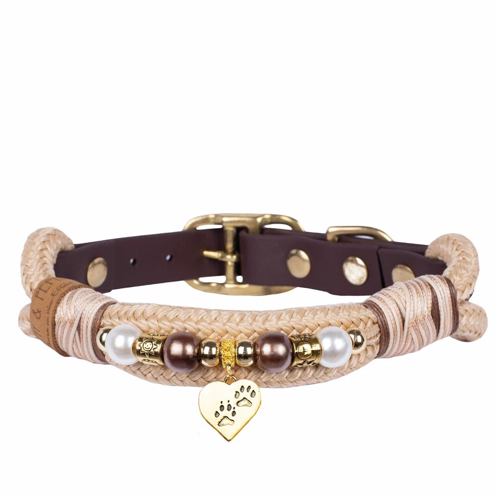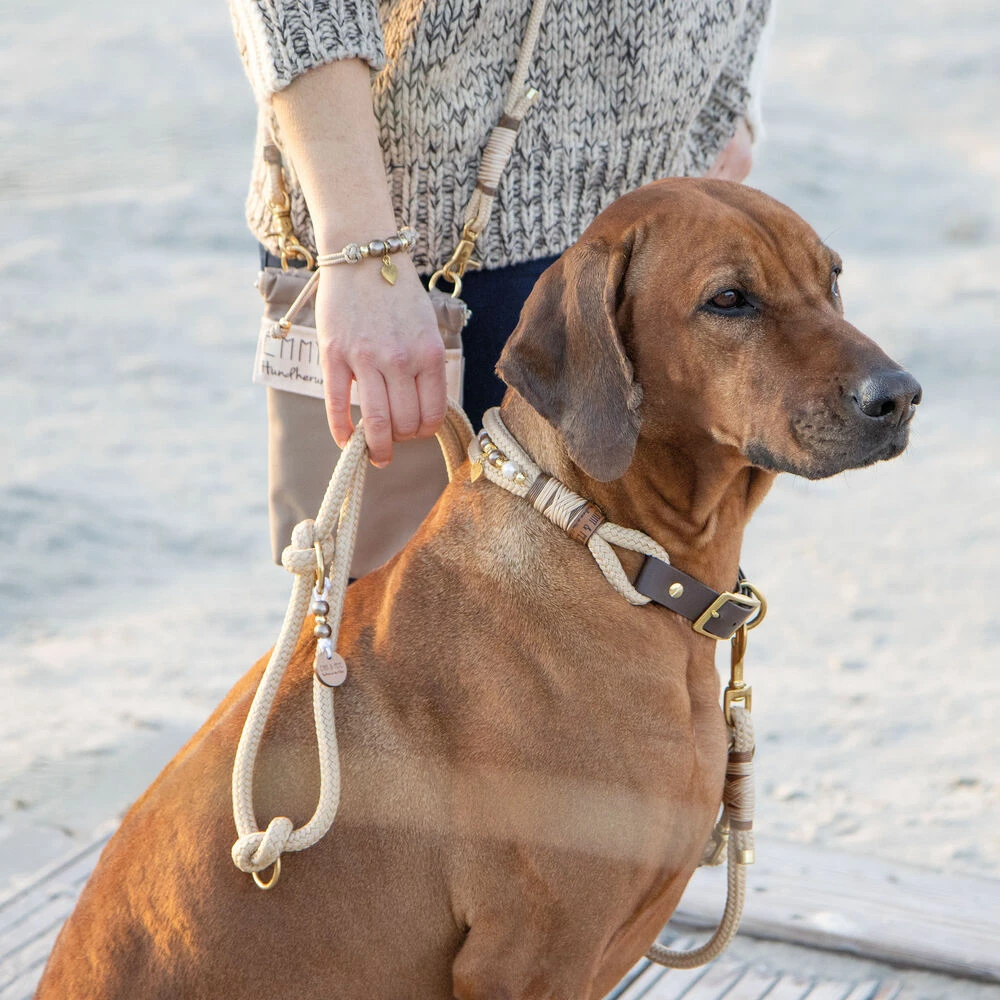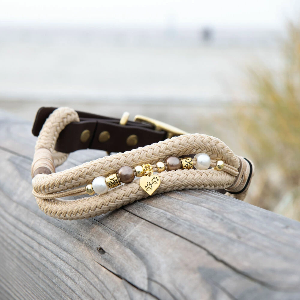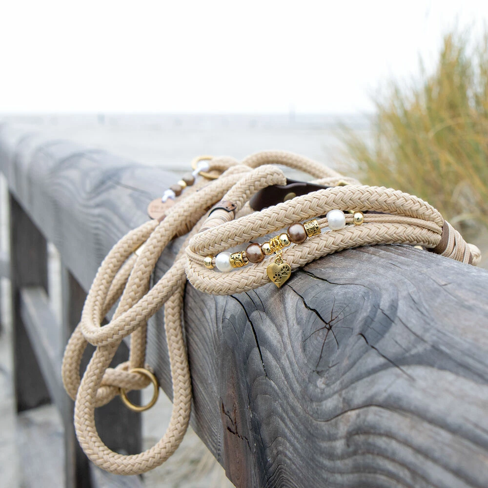 Dieses Tauhalsband Heidi von Emmy & Pepe ist etwas ganz Besonderes – mit den verspielten Details und Perlen zieht das Halsband alle Blicke auf Sie und Ihren Hund. In Kombination mit dem beigen Tau und den goldfarbenen Metallelementen ist das Halsband ein wahres Schmuckstück. In liebevoller Handarbeit gefertigt in Deutschland und in Kooperation mit Menschen mit Beeinträchtigungen entstanden. Robustes Tau und strapazierfähiges BioThane® machen das Halsband zum idealen Begleiter im Alltag. Das Material ist zudem schmutz- und wasserabweisend.