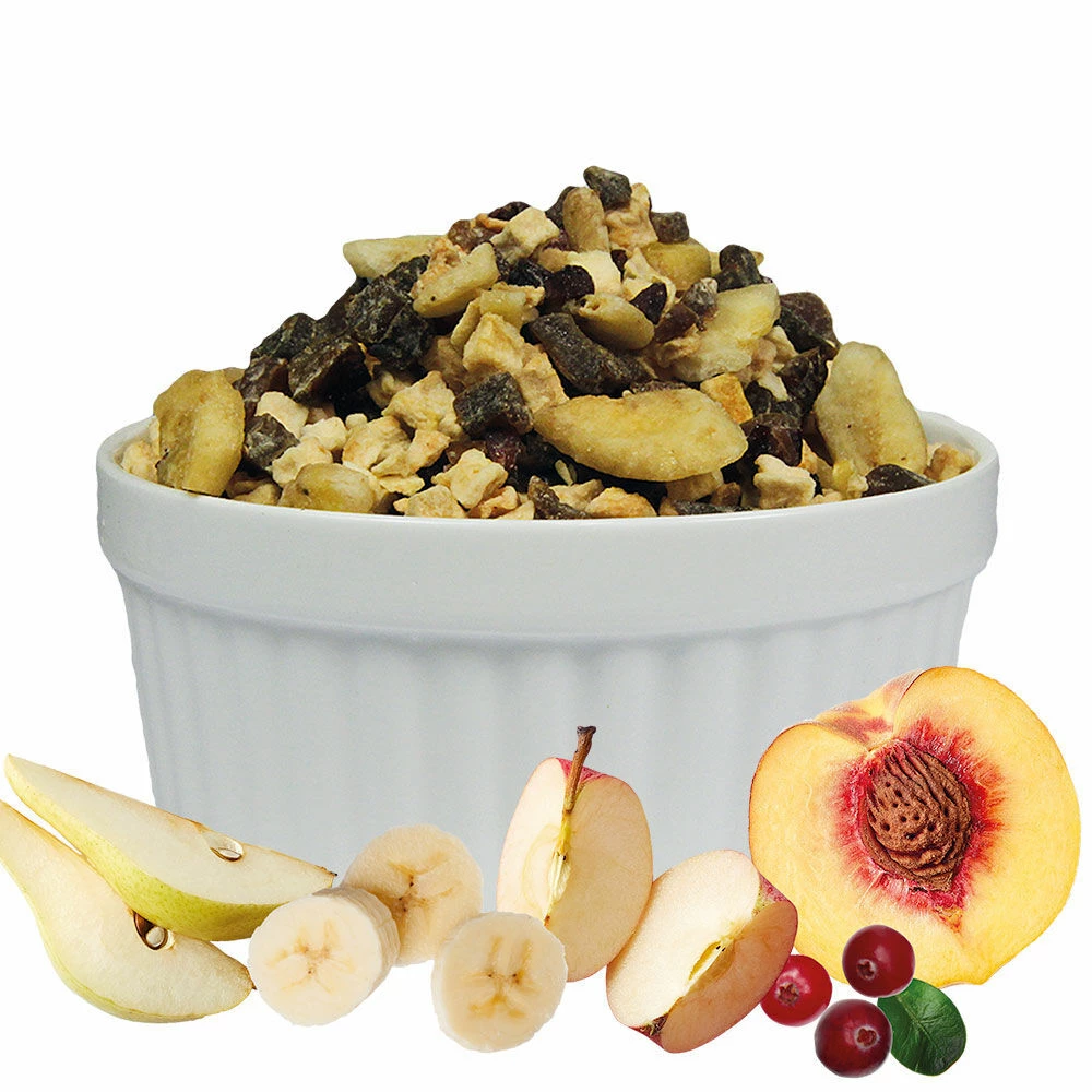 Fein geschnittener Obst-Mix für Hunde aus Banane, Pfirsich, Apfel, Birne, Dattel und Cranberry. Ideal zur Aufwertung beim BARFen* oder als geschmackliche Abwechslung bei der täglichen Fütterung.