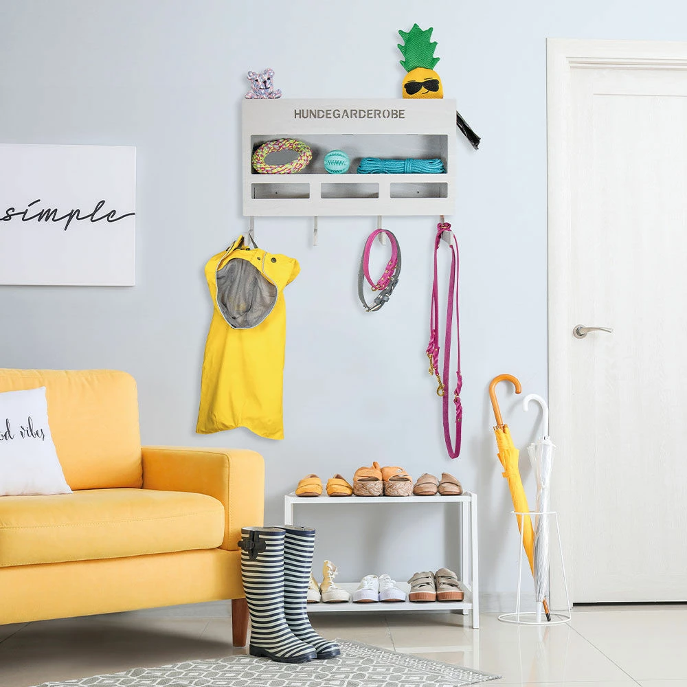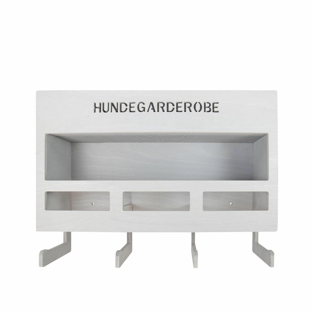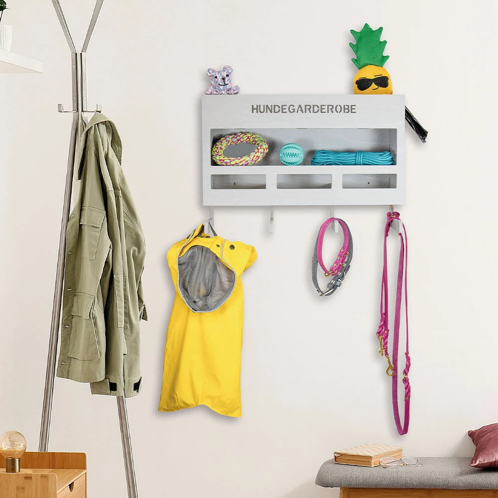 Endlich alle Utensilien Ihres Hundes geordnet an einem Platz – mit dieser großen Hundegarderobe wird der Traum zur Realität! Die in Deutschland handgefertigte Hundegarderobe bietet jede Menge Platz und Stauraum. An 4 großen Haken mit einer Fülltiefe von je ca. 10 cm finden jede Menge Leinen, Geschirre oder Hundemäntel Platz. Über den Haken befinden sich 3 Aussparungen zur Aufbewahrung von Halsbändern. Die Halsbandhalter sind je ca. 15 cm breit.