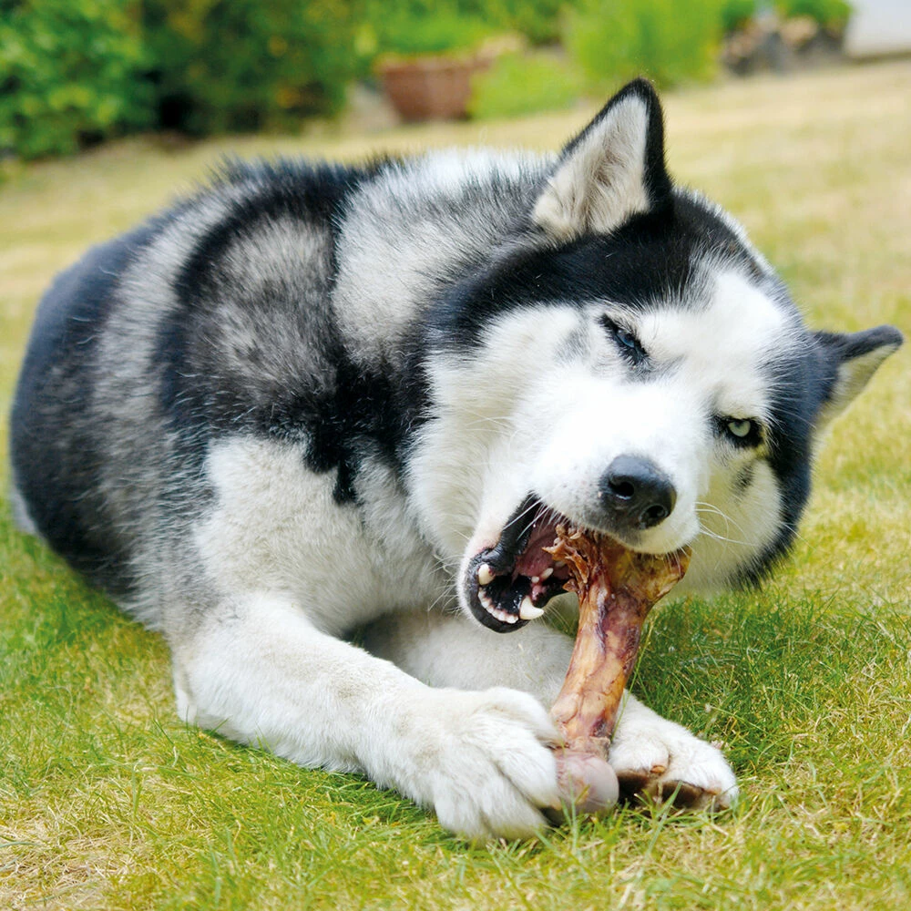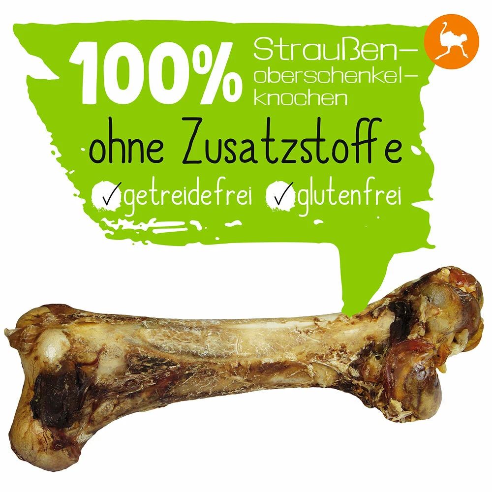 Echte Oberschenkelknochen vom afrikanischen Strauß. Dicke, ca. 30 / 50 cm lange Knochen, teils noch mit Sehnen- und Muskelansätzen. Ideal für empfindliche Hunde, da nur ausgiebig getrocknet jedoch nicht geräuchert.