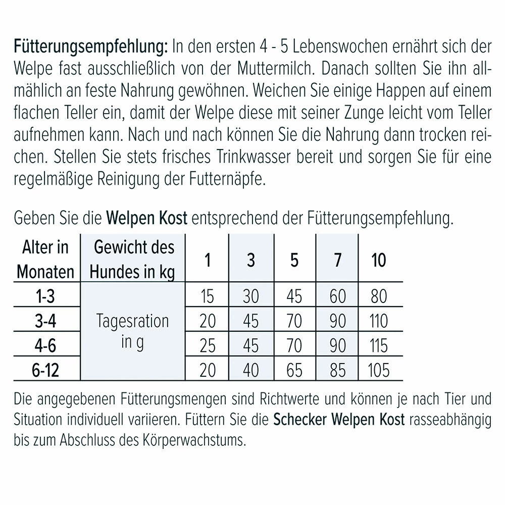 Mit diesem rundum gesunden Trockenfutter können Sie Ihre Welpen so richtig verwöhnen! Schecker Welpen Kost ist auf den besonderen Nährstoffbedarf von Welpen und Junghunden abgestimmt. Es ist reich an proteinreichem, leicht verdaulichem Huhn und sichert optimales Wachstum und idealen Muskelaufbau. Vitaminreiche Früchte und Kräuter wie Heidelbeeren, Äpfel und Rosmarin enthalten Bausteine, die das Immunsystem fördern. Kollagen, Krustentierschalen und Grünlippmuscheln unterstützen eine gesunde Entwicklung der Gelenke und Knorpel Ihres Welpen. Mit Calcium und Phosphor zur Unterstützung des Aufbaus von Knochen und Zähnen. Lachsöl sorgt für ein glänzendes, gesund aussehendes Fell.