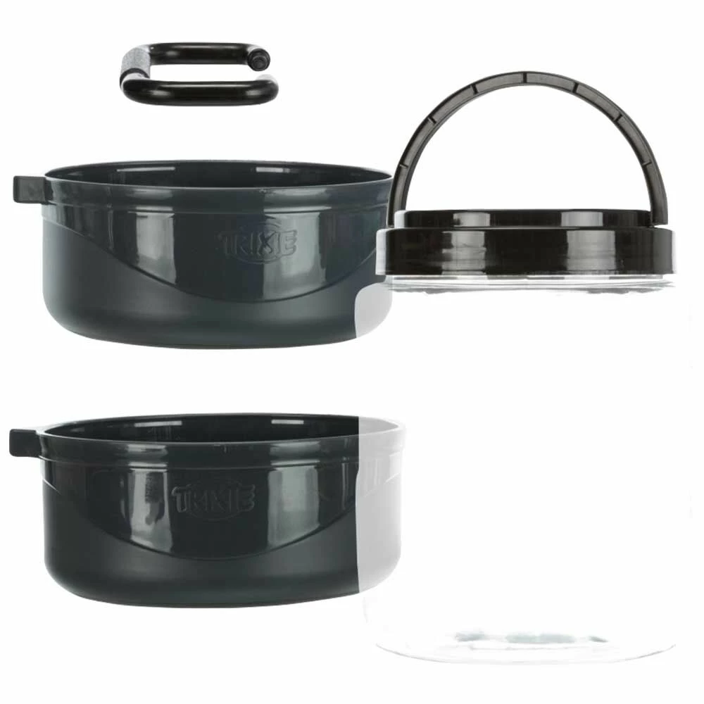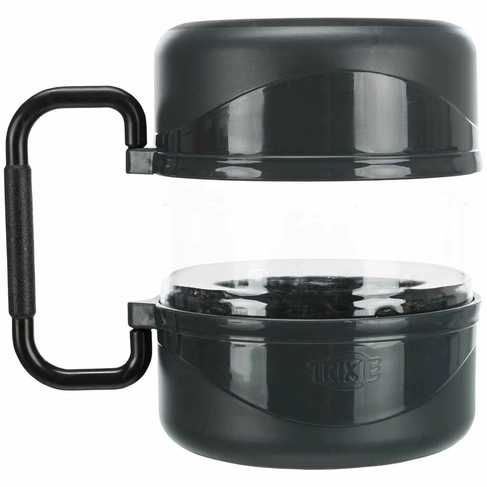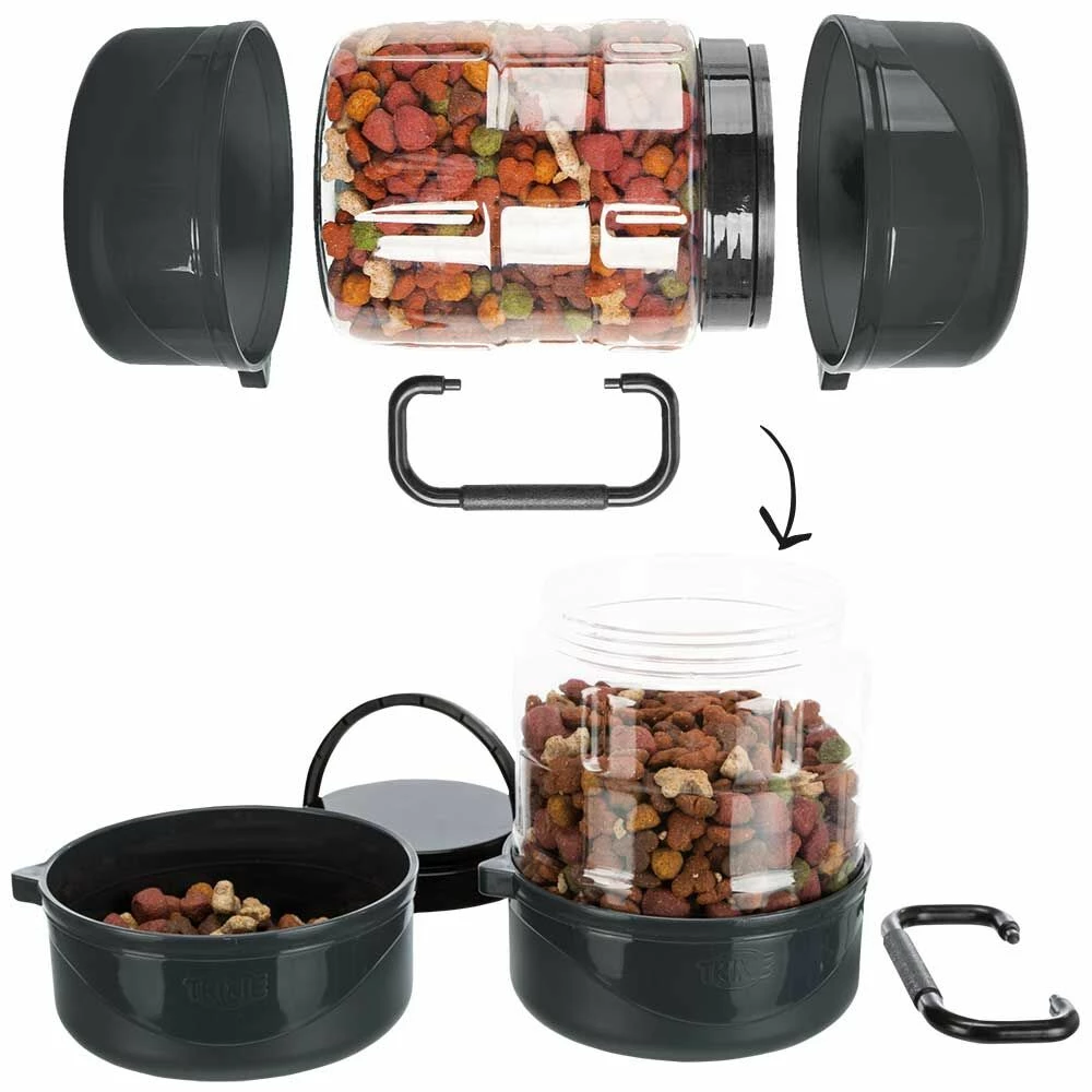 Diese super-praktische Futterbox ist eine ideale Möglichkeit, Ihren Liebling unterwegs zu versorgen. Sie besteht aus einer Frischhaltedose mit Schraubverschluss und zwei Kunststoffnäpfen. Alle drei Teile werden mit dem praktischen Tragegriff zu einer Einheit zusammengesetzt. So lässt sich das «Pausenbrot» für Ihren Liebling knackig-frisch und platzsparend verstauen. Die beiden Näpfe sind spülmaschinenfest, die Klarsicht-Futterbox bei Bedarf nur per Hand reinigen.